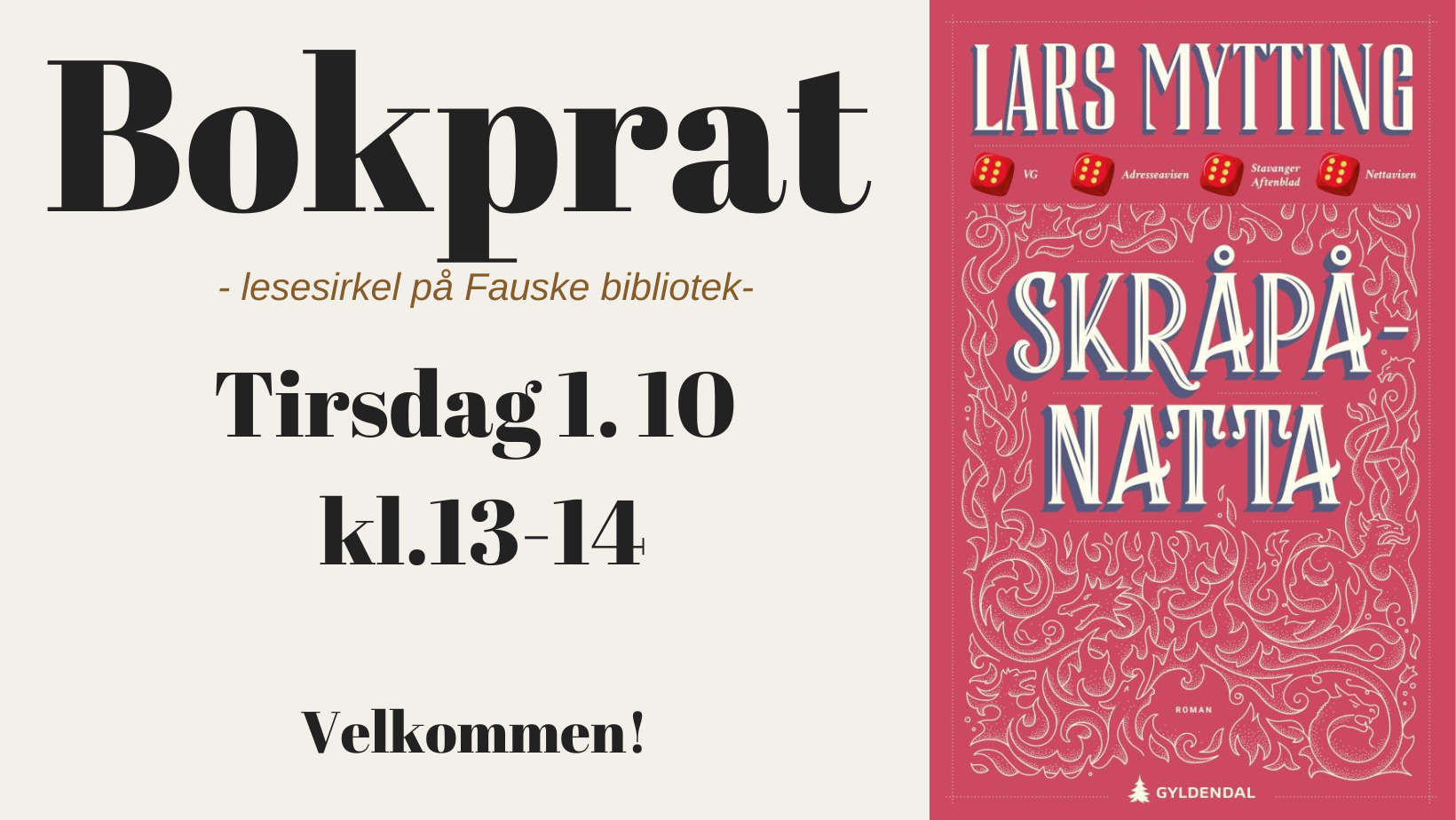 Vi leser samme bok og prater om boka. Eneste forutsetning for å delta er at du har lest boka som det blir prata om. Er den god, midt på treet, fantastisk, kjedelig, irriterende, tafatt eller noe helt annet? Det kan diskuteres!