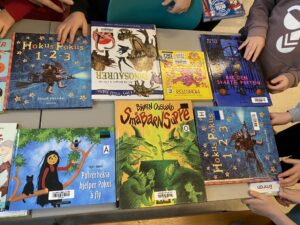 Ivrige elever i 1. og 2. trinn lånte mange flotte bøker da vi dro på skolebesøk.