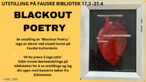 Vi har satt fram kasserte bøker i en kasse ved utstillinga. Ta ei kassert bok, velg deg ei bokside og lag din egen Blackout Poetry!