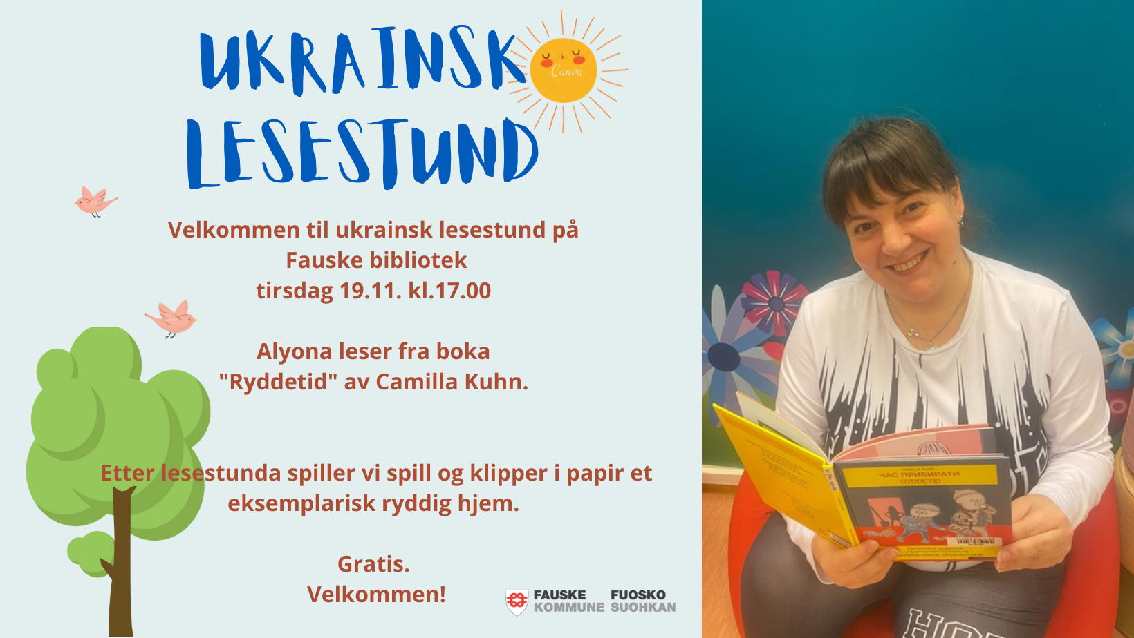 Tirsdag 19 .november kl.17 inviterer vi alle ukrainske barn i Fauske til lesestund med barnebibliotekar Alyona.